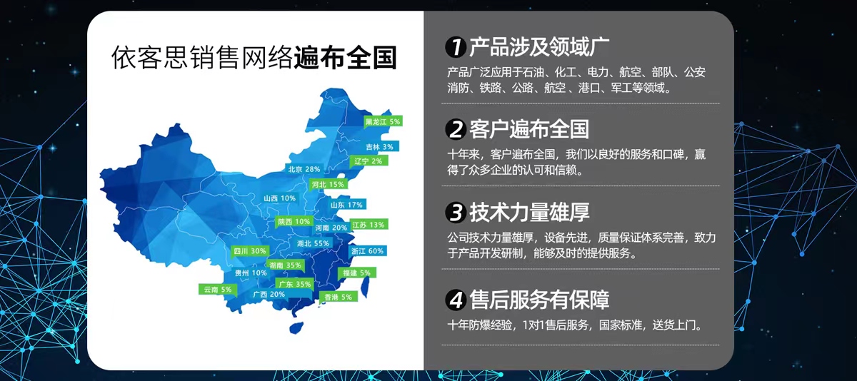 依客思防爆專注于防爆產(chǎn)品的研發(fā)、生產(chǎn)與銷售,主要產(chǎn)品有:防爆操作柱、BXCQ防爆靜電釋放儀、BZC系列防爆操作柱、不銹鋼現(xiàn)場操作箱、BXM(D)防爆照明(動力)配電箱、BXX防爆檢修箱、BXJ防爆接線箱、LED防爆燈、防爆管件、防爆風(fēng)機(jī)等產(chǎn)品,型號規(guī)格齊全,廣泛適用于煤炭、電力、醫(yī)藥、石油、化工、航空等領(lǐng)域。我公司產(chǎn)品質(zhì)量過硬,價格實(shí)惠,銷售范圍廣,且與各大型企業(yè)建立了良好的合作關(guān)系,同時還遠(yuǎn)銷中、東亞和北美等地區(qū),深受用戶喜愛與青睞。如有需要請留意,稍后將有客服與您聯(lián)系